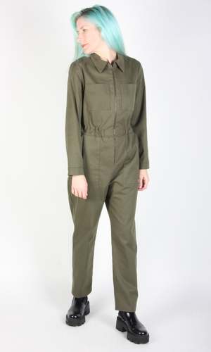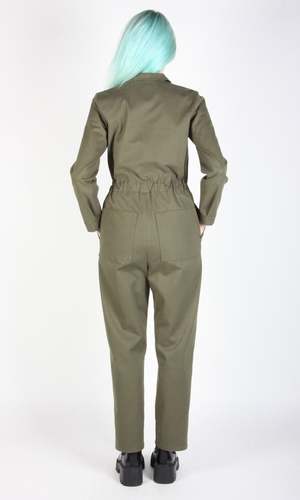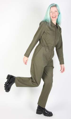 Rain Crow is a fall-weight boilersuit with an elastic waist, a collar, and lots of pockets! It has long sleeves with a cuff, and closes with an exposed metal zipper down the front. The inseam measures 27. This jumpsuit is made of 97% organic cotton, 3% spandex stretch twill and it can be washed on a cold delicate cycle and hung to dry. Candy is 6'1" and wears our size L, and Hayley is 5'7 and wears our size S. See our size chart here. This style is also available in Black. Made in Canada. Google product category 1604