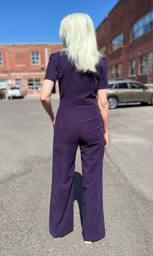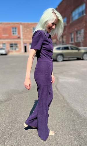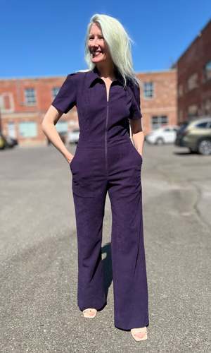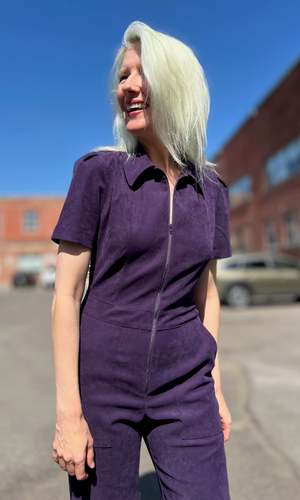 The Tyrannulet Jumpsuit is a beautifully tailored, zip-front jumpsuit with a collar, front and back pockets in the pant, and a perfectly flared leg. Made of a velvety fabric with a napped, suede-like finish and just the right amount of stretch. Can be hand or machine washed on a cold, delicate cycle and hung to dry. Fabric content: 97% polyester and 3% spandex. Tyrannulet fits true to size and has a good amount of stretch but will not stretch out. The inseam measures 32.5 (size 2) to 33.5" (size 20). Finished measurements of the jumpsuit bust/waist/hip, in inches: 2 - 34 / 29 / 38 4 - 35 / 30 / 39 6 - 36 / 31 / 40 8 - 37 / 32 / 41 10 - 39 / 34 / 43 12 - 41 / 36 / 45 14 - 43 / 38 / 47 16 - 45 / 40 / 49 18 - 48 / 43 / 52 20 - 52 / 46 / 56. Made in Canada.