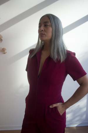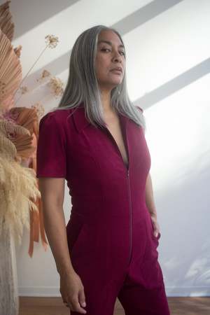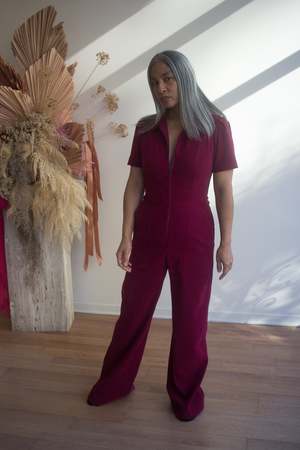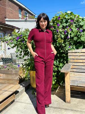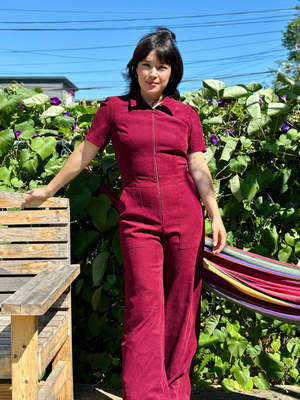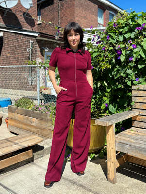 Birds of North America's velvety Tyrannulet Jumpsuit is a beautifully tailored, zip-front jumpsuit with a collar. It features front and back pockets in the pants and a perfectly flared leg. The stretch velvet fabric offers a deep and rich burgundy tone. Sizing Notes: This style fits true to size and has a good amount of stretch. Please see below for exact garment measurements. Mila is 5'5" and is wearing size 12, and Ruby is 5'10" and is wearing size 12. Finished measurements of the jumpsuit bust/waist/hip, in inches: 2 - 34 / 29 / 38 4 - 35 / 30 / 39 6 - 36 / 31 / 40 8 - 37 / 32 / 41 10 - 39 / 34 / 43 12 - 41 / 36 / 45 14 - 43 / 38 / 47 16 - 45 / 40 / 49 18 - 48 / 43 / 52 20 - 52 / 46 / 56 The inseam measures 32.5 (size 2) to 33.5" (size 20). 97% Polyester, 3% Spandex Fabric has stretch, but will not "stretch out". Wash cold on delicate, hang to dry. Made in Canada.