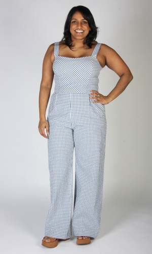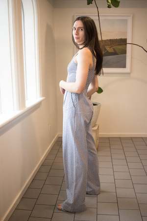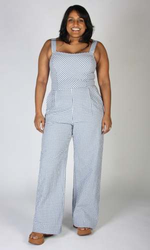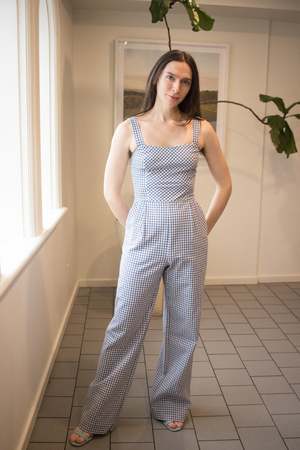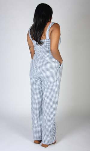 The Roadrunner Jumpsuit by Birds of North America is a tailored, wide leg jumpsuit made of medium-weight, organic cotton gingham. It has playful directional gingham details on the top, as well as the front pockets. The neckline is faced, and it closes with a back invisible zipper. Sizing Notes: This style fits true to size but there is no stretch. Please see below for exact garment measurements. Bobbie Jo is 5'7 and is wearing size 6. Hayley is 5'7 and is wearing size 6. Mila is 5'5" and is wearing size 12. Finished measurements of the actual jumpsuit in the bust/waist/hip, in inches, followed by the rise (in brackets) are as follows: 2 - 34 / 28 / 42 (12) 4 - 35 / 29 / 43 (12.25) 6 - 36 / 30 / 44 (12.25) 8 - 37 / 31 / 45 (12.5) 10 - 39 / 33 / 47 (12.5) 12 - 41 / 35 / 49 (12.75) 14 - 43 / 37 / 51 (13) 16 - 45 / 39 / 53 (13) 18 - 48 / 42 / 56 (13.5) 20 - 51 / 45 / 59 (14) 35" inseam on all sizes. 100% Organic Cotton. Fabric does not have stretch to it. Wash cold, delicate cycle, hang to dry. Made in Canada. Also available in Peach Gingham and Sage Gingham.