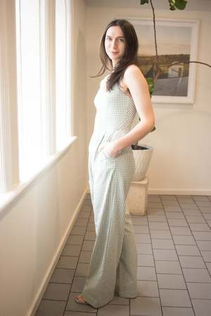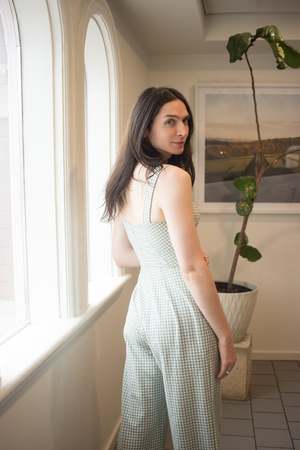 The Roadrunner Jumpsuit by Birds of North America is a tailored, wide-leg jumpsuit made of medium-weight, organic cotton gingham in Sage. It features playful directional gingham details on the top and front pockets, a faced neckline, and a back invisible zipper. Sizing Notes: This style fits true to size but there is no stretch. Please see below for exact garment measurements. Bobbie Jo is 5'7" and is wearing size 6. Erika is 5'0" and is wearing size 4. Finished measurements of the actual jumpsuit (bust/waist/hip in inches, with rise in brackets) are as follows: 2 - 34 / 28 / 42 (12) 4 - 35 / 29 / 43 (12.25) 6 - 36 / 30 / 44 (12.25) 8 - 37 / 31 / 45 (12.5) 10 - 39 / 33 / 47 (12.5) 12 - 41 / 35 / 49 (12.75) 14 - 43 / 37 / 51 (13) 16 - 45 / 39 / 53 (13) 18 - 48 / 42 / 56 (13.5) 20 - 51 / 45 / 59 (14) 35" inseam on all sizes. 100% Organic Cotton. Fabric does not have stretch. Wash cold on delicate cycle and hang to dry. Made in Canada. Also available in Peach Gingham and Blue Gingham.