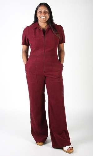 This item is lightly damaged and is part of the Birds of North America Studio Sale event. There is a long, narrow fabric flaw in the fabric on the lower left leg that shows more in some lights than in others. Tyrannulet is a brand new cut for Birds this season: a beautifully tailored, zip-front jumpsuit with a collar, front and back pockets in the pant, and a perfectly flared leg. It is made of a lovely velvety fabric with a napped, suede-like finish and the perfect amount of stretch. Tyrannulet can be hand or machine washed on a cold, delicate cycle and hung to dry, and it's made of 97% polyester and 3% spandex. We've cut Tyrannulet in this rich Bramble colour, as well as classic Black and a gorgeous, deep Conifer green. Mila is 5'5" and wears size 12. Tyrannulet fits true to our size chart. This jumpsuit has a good amount of stretch, but will not stretch out. The inseam measures 32.5" (size 2) to 33.5" (size 20). Finished measurements of the jumpsuit bust/waist/hip, in inches, are as follows: 2 - 34 / 29 / 38 4 - 35 / 30 / 39 6 - 36 / 31 / 40 8 - 37 / 32 / 41 10 - 39 / 34 / 43 12 - 41 / 36 / 45 14 - 43 / 38 / 47 16 - 45 / 40 / 49 18 - 48 / 43 / 52 20 - 52 / 46 / 56 Everything at Birds of North America is vegan and has been made ethically in Canada since 2007. We have a strong focus on sustainability and strive to create high-quality garments that last a long time.