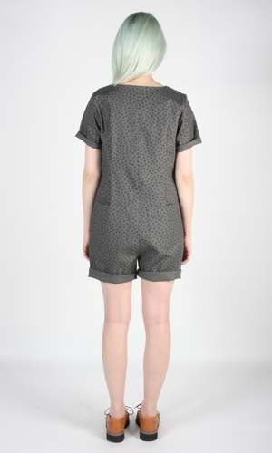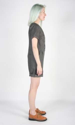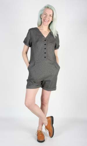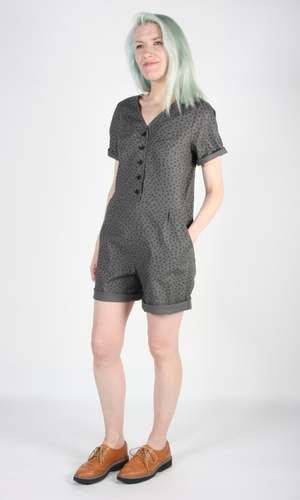 Woodhaunter is a relaxed fit shirt-style romper. It has a button front placket closure and both front and back pockets. This style is also available in Blue Hatch and Banana Leaves. Inseam: 7" Content: 55% Cotton, 45% Linen Hand wash cold, hang to dry. Made in Canada.