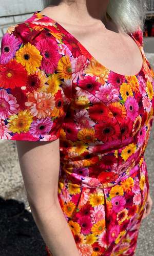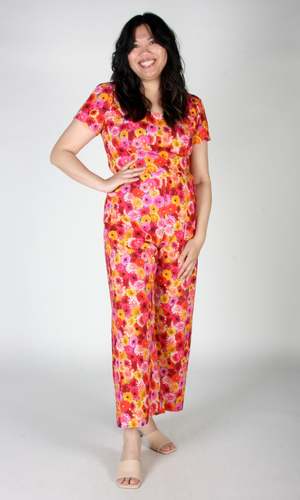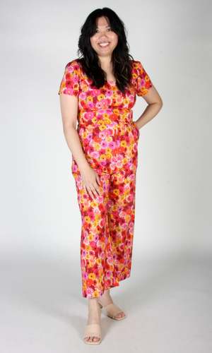 The Whinchat by Birds of North America is the perfect jumpsuit for spring, with a cropped, wide leg, short sleeve and a lovely scooped neck. Complete with pockets in the pants, and it closes with a back invisible zipper. This vibrant 'Petal Party' print features an explosion of red, pink and yellow Gerbera Daisies. Sizing Notes: This style fits true to size but there is no stretch. Please see below for exact garment measurements. Hayley is 5'7" and is wearing size 6, Hilary is 5'7" and is wearing size 12. Finished measurements of the actual jumpsuit in the bust/waist/hip: 2 - 35 / 27 / 40 4 - 36 / 28 / 41 6 - 37 / 29 / 42 8 - 38 / 30 / 43 10 - 40 / 32 / 45 12 - 42 / 34 / 47 14 - 44 / 36 / 49 16 - 46 / 38 / 51 18 - 49 / 41 / 54 20 - 53 / 45 / 58 26" Inseam on all sizes. 100% Cotton. Fabric does not have stretch to it. Wash cold, hang to dry. Made in Canada.