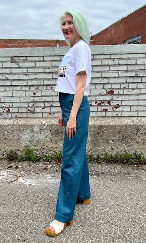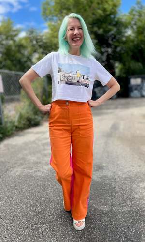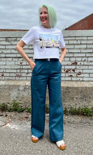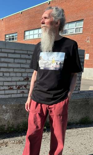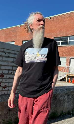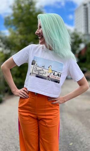 These tees are a collaboration between Birds of North America and artist Neil MacCormick. The 'Sparkle Bright Launderette' design is inspired by a childhood memory from Victoria, featuring a little girl in a yellow dress and red socks. Neil painted Sparkle Bright Launderette in 1994 while living in Victoria, capturing the unique feeling of the city and its nostalgic storefronts. Made in a Toronto factory from locally milled, medium weight, 100% organic cotton jersey. Machine washable and tumble dryable. The classic tees will shrink 1" total with a wash and dry, and the cropped tees will shrink just 1/2" total. There is no width shrinkage with washing and drying. Hayley is 5'7" and wears size XS Cropped White tee; Neil is 6'1" and wears size XL Classic Black tee. These tees fit on the larger side of the Birds size chart but fit as you would expect for a classic T-shirt. If you are going by your regular size in the Birds size chart, it is recommended to take a full size down (e.g., if you normally take a S in Birds, choose XS for this tee). If you have a favorite classic tee at home, lay it flat and measure across the chest to find the closest equivalent. Everything at Birds of North America is vegan and made ethically in Canada with a focus on sustainability and high-quality garments.
