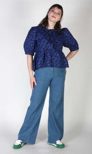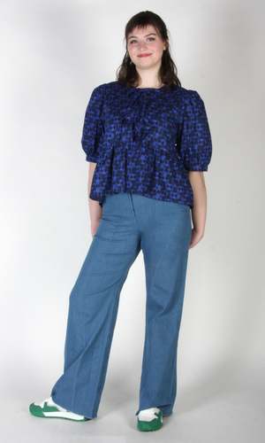 Special Notes: This item is part of our Studio Sale event and is lightly damaged. There are a couple of tiny holes on the ties. Nunlet is a tie-front top with full sleeves that gather into a cuff, and a breezy, relaxed fit. There is an under-flap at the front placket so you can still tie the top closed, but there is no gap in the front. This richly hued cotton print features transparent layers of blue, from cobalt and sapphire to navy. It is also available in Summer Sleep, Morning Pastoral, and Straw Flower. Shown here with Bloodfool pant in Medium Wash. Nunlet is made of 100% cotton, and can be hand or machine washed on a cold, delicate cycle and hung to dry. This top has a very relaxed silhouette, and if you would like a fit similar to what you see on the models, you can follow the size chart recommendations for your body measurements. Ruby is 5'10" and wears size M. The sleeve measures between 15 (XS) and 16 (3X) inches from the top of the shoulder to the hem. Finished measurements of the actual top in the bust, followed by the shoulder width, and shoulder-to-hem length (in brackets), in inches, are as follows: XS - 36 / 14 (22.5) S - 38 / 14.25 (22.75) M - 40 / 14.5 (23) L - 42 / 15 (23.25) XL - 44 / 15.5 (23.5) 2X - 48 / 15.75 (24) 3X - 52 / 16 (24.5) Everything at Birds of North America is vegan and has been made ethically in Canada since 2007. The brand has a strong focus on sustainability and strives to create high-quality garments that last a long time.