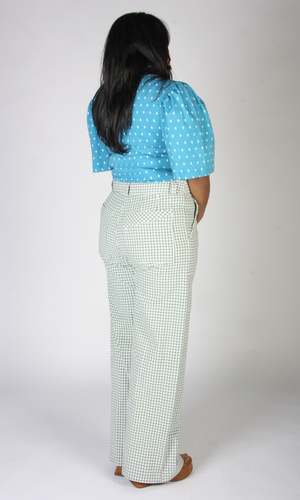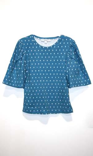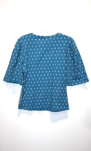 This item is lightly damaged. There is an allover fabric flaw in the printa very faint stripe that runs across the body in various places. It's very faint, but it's there. Peahen is a crew-neck knit top with an elbow-length full sleeve that is gathered at the shoulder. The fabric is a soft cotton jersey that contains 95% cotton and 5% spandex. Peahen has a ton of stretch and fits true to the Birds of North America size chart. The length of the body ranges from 21.5" (XS) to 23.5" (3X), and the sleeve length, measured from the top of the shoulder to the hem, measures 13" (XS) to 14.5" (3X). Finished measurements of the chest circumference in inches are as follows: XS - 32 S - 34 M - 36 L - 38 XL - 41 2X - 45 3X - 48 Peahen can be hand or machine washed on a cold, delicate cycle and laid flat to dry. Everything at Birds of North America is vegan and has been made ethically in Canada since the brand began in 2007. The company has a strong focus on sustainability and strives to create high-quality garments that last a long time.