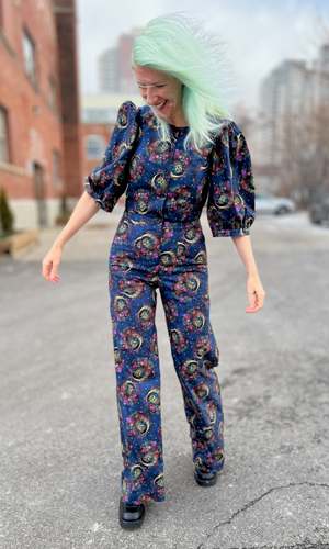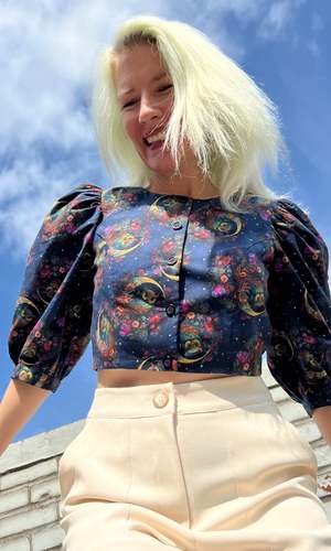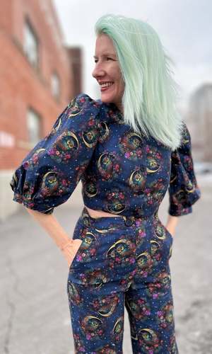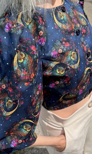Robin is a scoop-neck, button-front top with princess seams and a full sleeve that gathers into a cuff. This beautiful 100% cotton Night Owls print is lined in OEKO-Tex certified 100% cotton voile. This gorgeous print has richly hued owls perched in golden wreaths of crescent moon, gilded with blooming night flowers, all on a star-spangled midnight blue backdrop. Robin measures between 17(XS)-18.5(3X) inches in length from the shoulder to the hem. The sleeve measures 18" in all sizes from the top of the shoulder to the cuff. Finished measurements of the Robin top in the bust and waist, followed by the back shoulder width (in brackets), in inches, are as follows: XS - 34 / 27 (13.75) S - 36 / 29 (14) M - 38 / 31 (14.25) L - 40 / 33 (14.5) XL - 42 / 35 (14.75) 2X - 45 / 37 (15) 3X - 48 / 40 (15.5) Robin fits on the smaller side of our size chart this season. We recommend sizing up a half to a full size from what your body measurements indicate on our size chart. Since this is a button-front top, you don't want it to fit too snugly or the buttons gape, so it's best to go larger! Mila is 5'5" and wears our size XL with Bloodfool pants in Red Clay. Robin can be hand or machine washed on a cold, delicate cycle and hung to dry. Everything at Birds of North America is vegan and has been made ethically in Canada since we began in 2007. We have a strong focus on sustainability, and strive to create high-quality garments that last a long time.