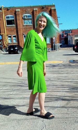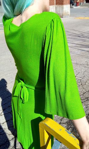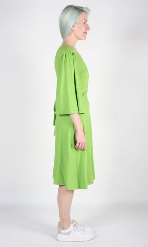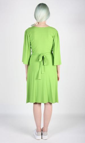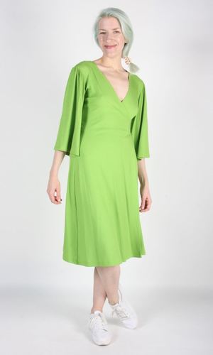 Palmcreeper is a wrap dress made of soft, ribbed bamboo rayon. It has a full sleeve with a gathered head, and ties at the waist with a belt. This fabric is OEKO-TEX certified, meaning that every component has been tested for harmful substances and found not to be ecologically harmful. This style is also available in Burgundy, Forest, Black, and Bluebell. Shoulder to hem is 46". Content: 95% Bamboo Rayon, 5% Spandex Hand wash cold, lay flat to dry. See our size chart here. Made in Canada. Google product category 212