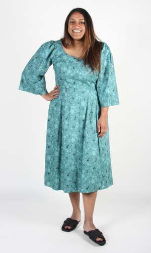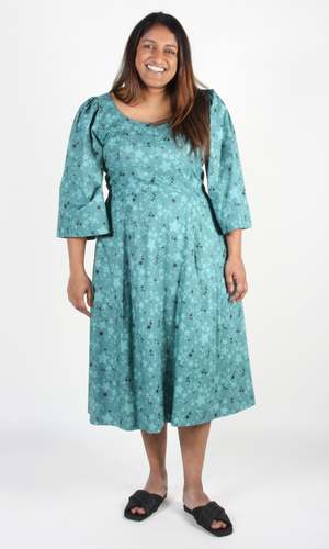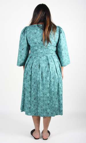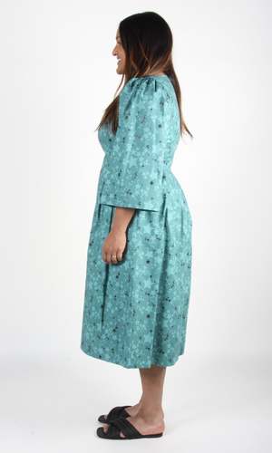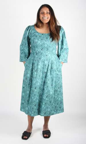 Rock Dove is a cotton dress with a midi-length pleated skirt, full sleeves, and a scooped neck. It has pockets in the skirt, and is lined in cotton voile. It closes with a back invisible zipper. Shoulder to hem is 44". Content: 100% Cotton Hand wash cold, hang to dry. Made in Canada.