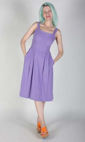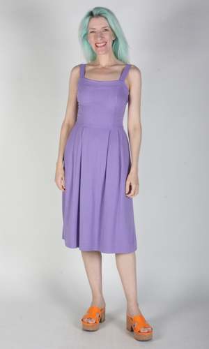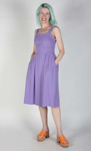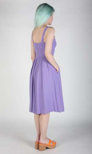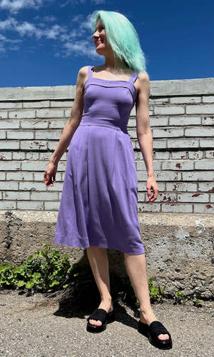 Thornbill is a perfectly simple, strappy summer dress, made of soft and breathable rayon/linen noil. This cut has a lovely fit and flare shape, but the fabric has lots of give, so its very comfortable to wear! It has a curved, fold-over flap at the bust as well as pockets in the skirt. The fabric is 75% rayon and 25% linen, and it closes with an invisible zipper at the back. Thornbill can be hand or machine washed on a cold, delicate cycle and hung to dry. It is also available in Black, Red and Golden Moss! Hayley is 5'7" and wears our size 6. Thornbill measures 44"(2) to 46.5"(20) from shoulder to hem - you can see our size chart here. Everything at Birds of North America is vegan and has been made ethically in Canada since we began in 2007. We have a strong focus on sustainability, and strive to create high-quality garments that last a long time. You can browse vintage Birds styles that we've gathered back as part of our buyback program in our ReNesting section!
