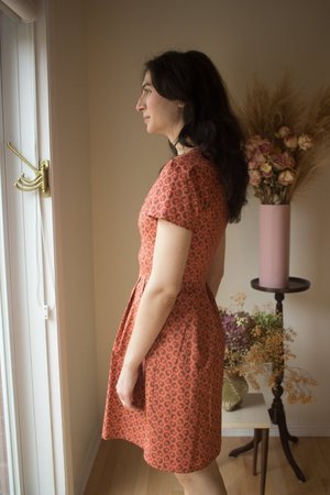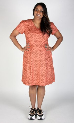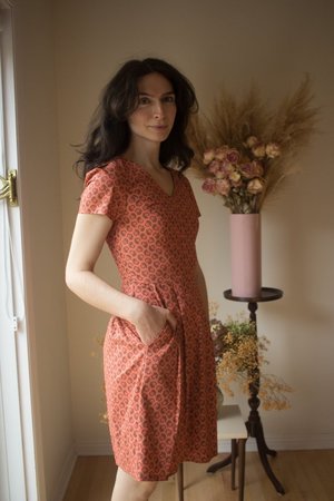 Birds of North America's Fruit Dove Dress is an update of their beloved and long-running Engoulevent style. The Fruit Dove features the same short capped sleeves, waist pleats and front skirt pockets you love, but is updated with a brand new V-neck to reveal some skin. The invisible back zipper makes this easy to take on and off. This is a timeless-meets-fun dress perfect for a special occasion! Sizing Notes: This dress is fitted without much stretch. We recommend your usual size or going one up for slightly more room. Bobbie Jo is wearing size 6 Mila is 5'5" and is wearing size 14 Finished measurements of the actual dress in the bust/waist/hip, in inches, are: 2 - 34 / 27 / 48 4 - 35 / 28 / 49 6 - 36 / 29 / 50 8 - 37 / 30 / 51 10 - 39 / 32 / 53 12 - 41 / 34 / 55 14 - 43 / 36 / 57 16 - 45 / 38 / 59 18 - 48 / 41 / 62 20 - 51 / 44 / 65 Shell: 100% Cotton (Oeko-Tex Certified) Skirt Lining: 95% Polyester, 5% Spandex Fabric does not have much stretch to it Also available in Aviary, Frost Bud, & Lepidoptera