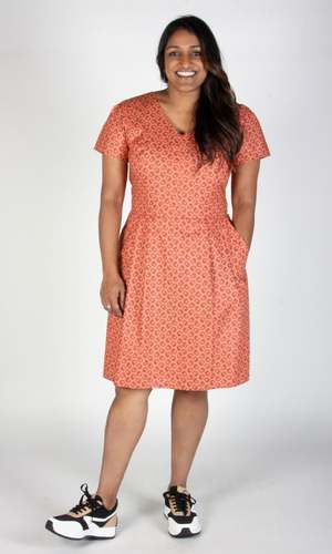 Fruit Dove is one of our classic fit and flare cuts, with capped sleeves and a V-neck, as well as pleats at the waist and front skirt pockets. The shell of Fruit Dove is 100% cotton, and the skirt is lined in OEKO-Tex certified, soft stretch satin that is 95% polyester, and 5% spandex. It closes with an invisible zipper down the back, and can be hand or machine washed on a cold delicate cycle and hung to dry. This charming cotton print has a beautiful dark rose background, with a traditional sheaf motif in maroon. Fruit Dove is also available in Aviary, Frost Bud and Lepidoptera! Mila is 5'5" and wears our size 14. Fruit Dove measures 37.5"(2) to 40.5"(20) from shoulder to hem - you can see our size chart here. Finished measurements of the actual dress in the bust/waist/hip, in inches, are: 2 - 34 / 27 / 48 4 - 35 / 28 / 49 6 - 36 / 29 / 50 8 - 37 / 30 / 51 10 - 39 / 32 / 53 12 - 41 / 34 / 55 14 - 43 / 36 / 57 16 - 45 / 38 / 59 18 - 48 / 41 / 62 20 - 51 / 44 / 65 Everything at Birds of North America is vegan and has been made ethically in Canada since we began in 2007. We have a strong focus on sustainability, and strive to create high-quality garments that last a long time. You can browse vintage Birds styles that we've gathered back as part of our buyback program in our ReNesting section!