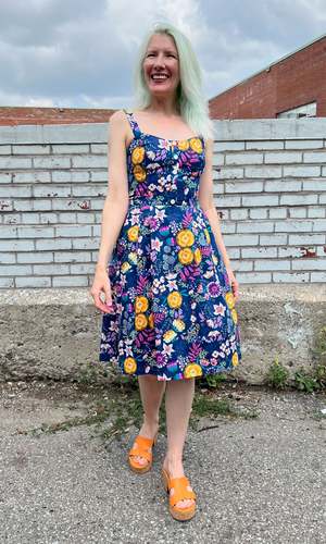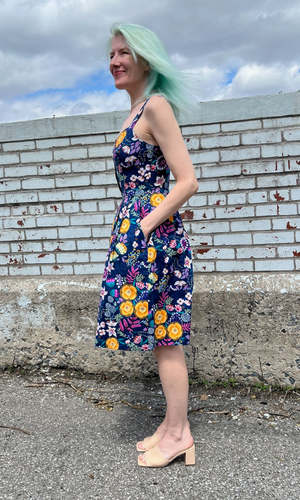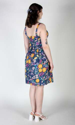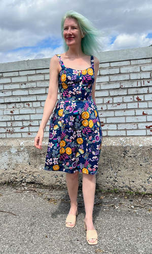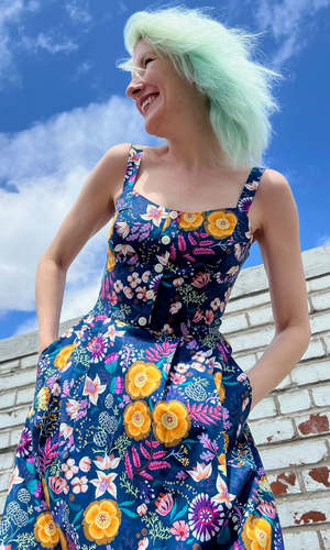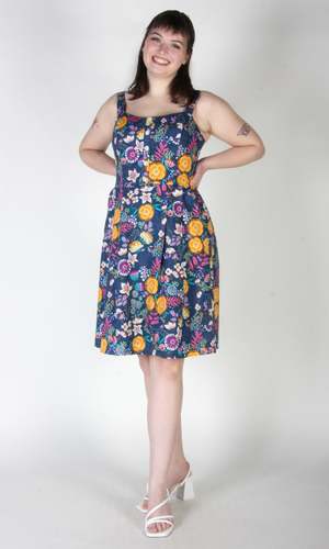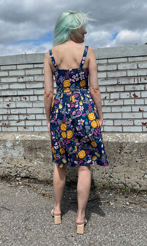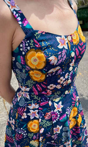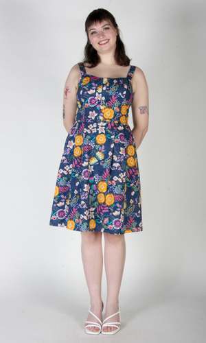Corncrake is a cotton sundress with a fit and flare silhouette and button placket detail on the front. It has pleats at the waist and front skirt pockets, and it closes with a back invisible zipper. This gorgeous Midnight Brilliance print features vibrant blooms in ochre, violet, cream, and magenta on a beautiful midnight blue background. Corncrake is also available in Parrot Jungle and Flower Toss. This dress is made of 100% cotton and is fully lined in OEKO-Tex certified cotton voile. It can be washed on a cold delicate cycle and hung to dry. This style fits true to our size chart. Ruby is 5'10" and wears our size 10. Finished measurements of the actual dress in the bust/waist/hip, followed by shoulder-to-hem-length (in brackets), in inches, are as follows: 2 - 34 / 27 / 60 (39) 4 - 35 / 28 / 61 (39.5) 6 - 36 / 29 / 62 (40) 8 - 37 / 30 / 63 (40) 10 - 39 / 32 / 65 (40.5) 12 - 41 / 34 / 67 (40.5) 14 - 43 / 36 / 69 (41) 16 - 45 / 38 / 71 (41) 18 - 48 / 41 / 74 (41.5) 20 - 51 / 44 / 77 (42).