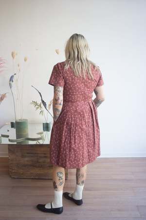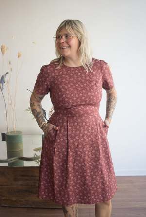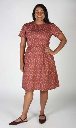The Buttonquail Dress by Birds of North America is an easy-to-wear short-sleeve top and knee-length pleated skirt with an invisible back zipper and side skirt pockets. This Parlour print features a deep brick red background with delicate cream-colored leafy sprays. This dress is fitted without stretch. Please see below for the actual garment measurements or consult the size chart for fit guidance. Kat is wearing size 10, Hayley is 5'7" and is wearing size 6, Mila is 5'5" and is wearing size 12. Finished measurements of the dress bust/waist/hip, and shoulder to hem length (in brackets), in inches, are as follows: 2 - 33 / 26 / 55 (39) 4 - 34 / 27 / 56 (39) 6 - 35 / 28 / 57 (39.5) 8 - 36 / 29 / 58 (39.5) 10 - 38 / 31 / 60 (40) 12 - 40 / 33 / 62 (40) 14 - 42 / 35 / 64 (40) 16 - 44 / 37 / 66 (40) 18 - 47 / 40 / 69 (40.5) 20 - 50 / 43 / 72 (41) The skirt, from waist to hem on all sizes, measures 23.5". 100% cotton with a 100% OEKO-Tex certified cotton voile lining in the skirt. Wash cold on delicate, hang to dry. Made in Canada.