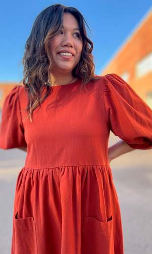 The Flowerpiercer Dress is a relaxed fit style made of thick, textured 100% cotton. It features in-seam skirt pockets and full sleeves that gather into a cuff. The dress slips on over the head and closes with a button and loop at the back neck. Care: Hand or machine wash on a cold, delicate cycle and hang to dry. Fit: This dress has a very relaxed silhouette. For a fit similar to what you see on the models, follow the size chart recommendations for your body measurements. Model: Hilary is 5'7" and wears size L. Sleeve measures 18" (XS) to 19" (3X) from shoulder to cuff. Finished measurements (in inches): XS - Bust/Hip: 36/68, Length: 36, Shoulder-to-Shoulder: 14.5 S - Bust/Hip: 38/70, Length: 36.5, Shoulder-to-Shoulder: 14.5 M - Bust/Hip: 40/72, Length: 37, Shoulder-to-Shoulder: 15 L - Bust/Hip: 42/74, Length: 37, Shoulder-to-Shoulder: 15 XL - Bust/Hip: 45/77, Length: 38, Shoulder-to-Shoulder: 16 2X - Bust/Hip: 48/80, Length: 38, Shoulder-to-Shoulder: 16.5 3X - Bust/Hip: 52/84, Length: 38.5, Shoulder-to-Shoulder: 17 Made in Canada.