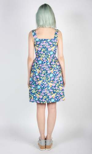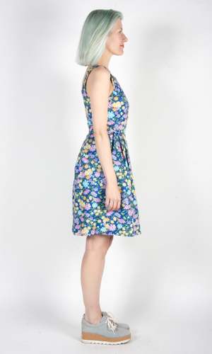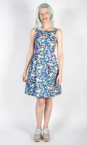 Welcome the season in this gorgeous cotton print, Blue Meadow, featuring a fragrant looking field of spring wildflowers on a deep blue background! Myrmidon has a high, square neckline, and a pleated skirt with deep front pockets. The dress and lining of Myrmidon are both 100% cotton, and it closes with an invisible zipper down the back. The dress measures about 39" from shoulder to hem. Hayley is 5'7" and wears our size 6. This style fits small - please see below! You can hand or machine wash this dress on a cold, delicate cycle, and hang it to dry. This style is also available in Somniferum and Hodgepodge. Made in Canada. Please note: This style fits close to a full size smaller than what our size chart indicates. We recommend sizing up, or if you are between sizes we recommend choosing the larger size.