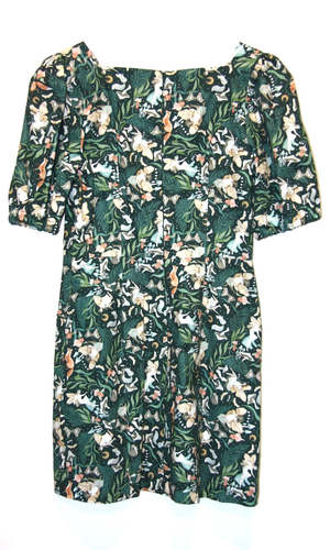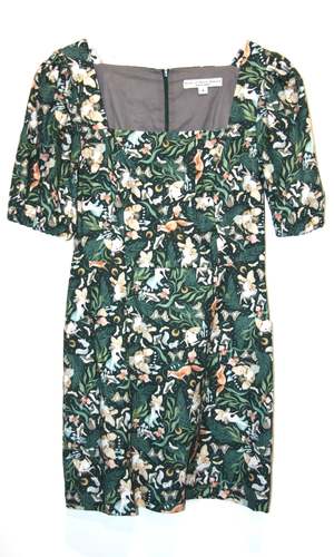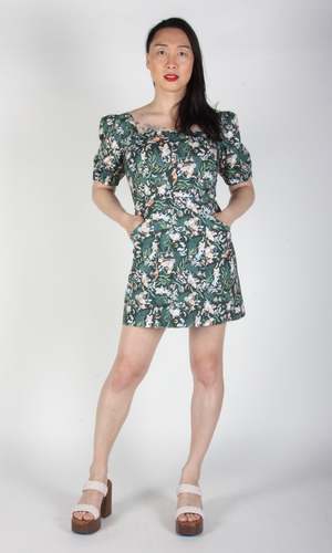 Chickadee is a tailored sheath dress with gently puffed, short sleeves and a square neckline. It's fully lined, and both the shell and lining are made of 100% cotton. Chickadee has flat pockets on the skirt front, and it closes with an invisible zipper down the back. From shoulder to hem this dress measures approximately 33.5". Hannah is 5'9" and wears our size 10. You can hand or machine wash this dress on a cold, delicate cycle, and hang it to dry. Made in Canada.