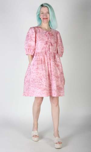 The Corvid Dress by Birds of North America is a playful baby doll cut featuring a tie-front, generous in-seam skirt pockets, full sleeves that gather into a cuff, and a breezy, relaxed fit. The dress includes an under-flap at the front placket to ensure closure without gaps. This rosy cotton toile showcases a tranquil pastoral scene with ducks and bunnies around a country house. Sizing Notes: This dress has a relaxed fit but fits true to size and has no stretch. We recommend ordering your usual size. Please see below for exact garment measurements. The sleeve measures between 15(XS)-16(3X) inches from top of the shoulder to the hem. Finished measurements of the actual dress bust/hip followed by shoulder-to-hem-length (in brackets), in inches, are as follows: XS - 36/68 (36.75) S - 38/70 (37) M - 40/72 (37.25) L - 42/74 (37.5) XL - 45/76 (38) 2X - 48/79 (38.5) 3X - 52/83 (39) 100% Cotton Fabric does not have stretch to it and will shrink very little in wash. Wash cold delicate, hang to dry. Made in Canada.