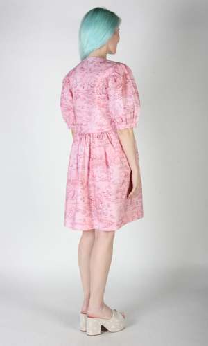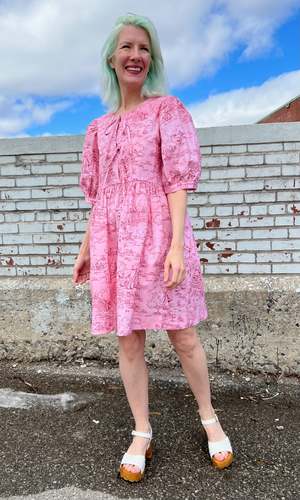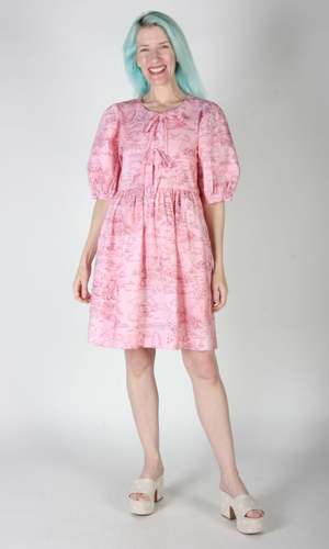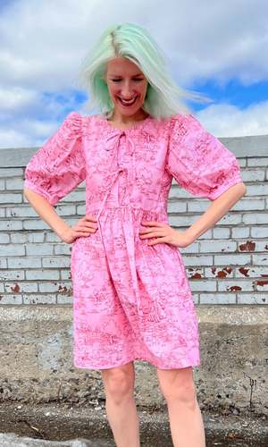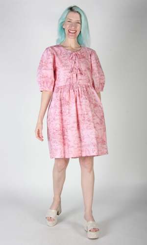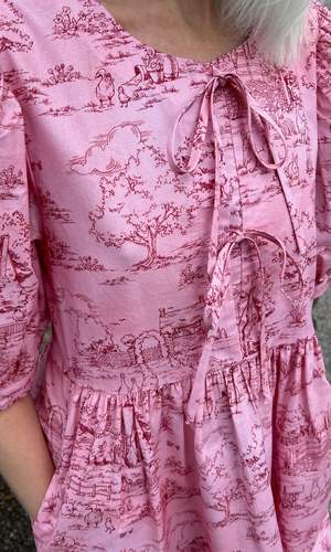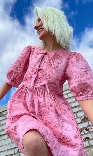 Corvid is a tie-front summer dress with generous in-seam skirt pockets, full sleeves that gather into a cuff, and a breezy, relaxed fit. There is an under-flap at the front placket so you can still tie the top of the dress closed, but there is no gap in the front! This rosy cotton toile features tranquil pastoral scenes, with sweet ducks and bunnies milling around a country house. Corvid is made of 100% cotton, and can be hand or machine washed on a cold, delicate cycle and hung to dry. This dress has a very relaxed silhouette, so if you would like a fit similar to what you see on the models, you can follow our size chart recommendations for your body measurements. Everything at Birds of North America is vegan and has been made ethically in Canada since we began in 2007. We have a strong focus on sustainability, and strive to create high-quality garments that last a long time.