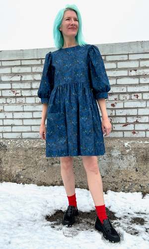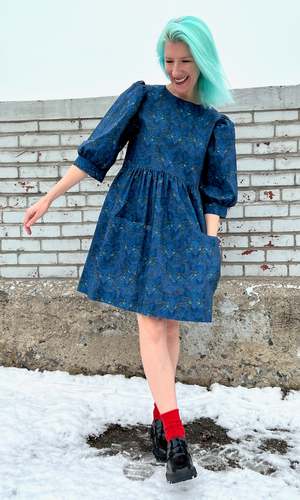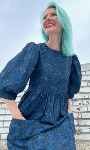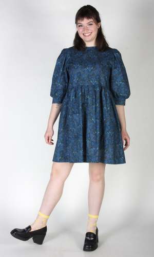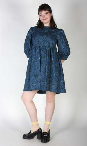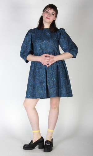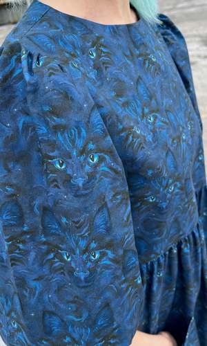 Welcome to the Meowniverse! One of our most beloved cuts, Devil Downhead, is back in an extra special cotton print that features star-spangled, turquoise-eyed, midnight-blue cats emerging from deep space. This silhouette has become one of our most beloved at Birds, both for its comfort and ease of wear, as well as for its easy, chic style. Devil Downhead has a tiered, relaxed fit, with front patch pockets and an ultra-full elbow-length sleeve that gathers at the cuff. It pops on over the head and closes with a button and loop at the back neck. Devil Downhead is made of 100% cotton and can be hand or machine washed on a cold, delicate cycle and hung to dry. This dress has a very relaxed silhouette, so if you would like a fit similar to what you see on the models, you can follow our size chart recommendations for your body measurements. Everything at Birds of North America is vegan and has been made ethically in Canada since we began in 2007. We have a strong focus on sustainability and strive to create high-quality garments that last a long time.