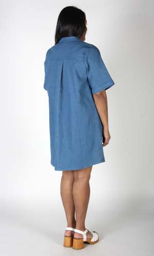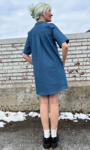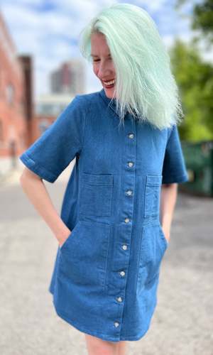 Turr is a workwear-style denim dress with an easy-to-wear A-line silhouette. It features four front pockets, a button front closure, and stretch denim for comfortable movement. This dress has been pre-washed to eliminate shrinkage and can be hand or machine washed on a cold, delicate cycle and hung to dry. The fabric composition is 70% cotton, 28% polyester, and 2% spandex. Turr dress has a relaxed silhouette; for a fit similar to the models, refer to our size chart. Hayley is 5'7" and wears size XS, while Mila is 5'5" and wears size L. Note: The Dark Wash version is approximately 1.5" longer than this Medium Wash version. Finished measurements (in inches): XS - Bust: 41, Hip: 47, Length: 34.5, Shoulder-to-shoulder: 14; S - Bust: 43, Hip: 49, Length: 35, Shoulder-to-shoulder: 14.5; M - Bust: 45, Hip: 51, Length: 35.5, Shoulder-to-shoulder: 14.75; L - Bust: 47, Hip: 53, Length: 35.5, Shoulder-to-shoulder: 15; XL - Bust: 49, Hip: 55, Length: 36, Shoulder-to-shoulder: 15.25; 2X - Bust: 52, Hip: 58, Length: 36, Shoulder-to-shoulder: 15.5; 3X - Bust: 55, Hip: 60, Length: 36.5, Shoulder-to-shoulder: 16.25.