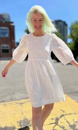 Bluebonnet is a relaxed fit, cotton eyelet dress with in-seam skirt pockets and full sleeves that gather into a cuff. It pops on over the head, and closes with a button and loop at the back neck. Bluebonnet is also available in Yuzu, Ube, and Black. Bluebonnet is made of 100% cotton eyelet, and the body is lined in matching OEKO-Tex certified 100% cotton voile. It can be hand or machine washed on a cold, delicate cycle and hung to dry. This dress has a very relaxed silhouette, so if you would like a fit similar to what you see on the models, you can follow our size chart recommendations for your body measurements. Marie is 5'1" and wears our size 2X. The sleeve measures 18"(XS)-19(3X)" from shoulder to cuff. Finished measurements of the body of the dress, in inches, are as follows: Bust/hip, shoulder-to-hem-length (in brackets), then shoulder-to-shoulder: XS - 36 / 68 (36) 14.5 S - 38 / 70 (36.5) 14.5 M - 40 / 72 (37) 15 L - 42 / 74 (37) 15 XL - 45 / 77 (38) 16 2X - 48 / 80 (38) 16.5 3X - 52 / 84 (38.5) 17. Everything at Birds of North America is vegan and has been made ethically in Canada since we began in 2007. We have a strong focus on sustainability and strive to create high-quality garments that last a long time.