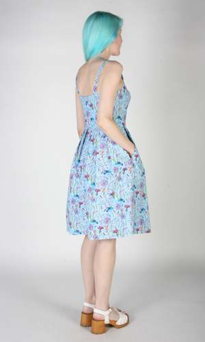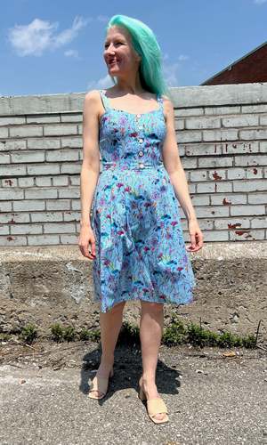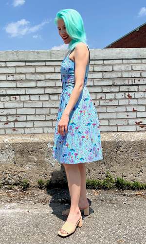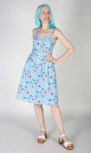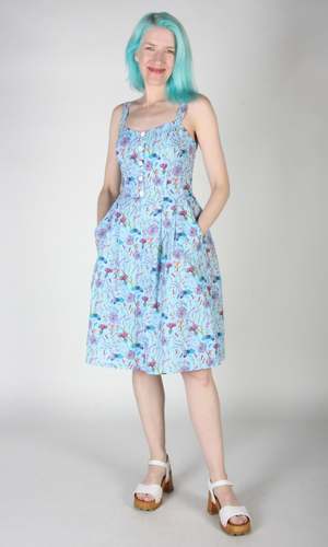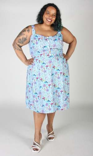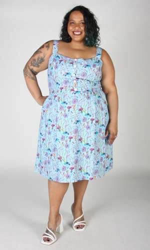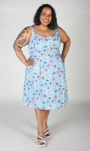 Corncrake is a cotton sundress with a fit and flare silhouette and button placket detail on the front. It has pleats at the waist and front skirt pockets, and it closes with a back invisible zipper. This Flower Toss print features colourful thistles and wildflowers on a sky blue background. Corncrake is also available in Midnight Brilliance and Flower Toss. This dress is made of 100% cotton, and is fully lined in OEKO-Tex certified cotton voile. It can be washed on a cold delicate cycle and hung to dry. This style fits true to our size chart. Marie is 5'1" and wears our size 18, and Hayley is 5'7" and wears our size 6. Finished measurements of the actual dress in the bust/waist/hip, followed by shoulder-to-hem-length (in brackets), in inches, are as follows: 2 - 34 / 27 / 60 (39) 4 - 35 / 28 / 61 (39.5) 6 - 36 / 29 / 62 (40) 8 - 37 / 30 / 63 (40) 10 - 39 / 32 / 65 (40.5) 12 - 41 / 34 / 67 (40.5) 14 - 43 / 36 / 69 (41) 16 - 45 / 38 / 71 (41) 18 - 48 / 41 / 74 (41.5) 20 - 51 / 44 / 77 (42).