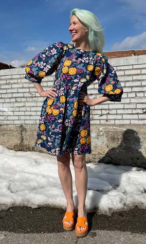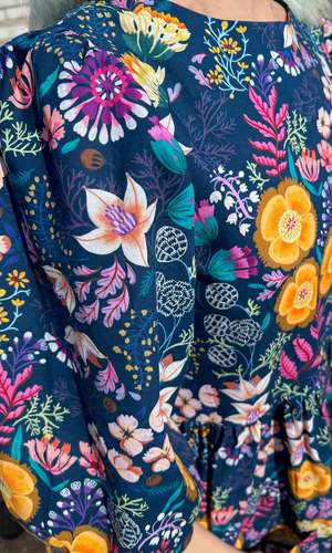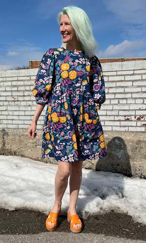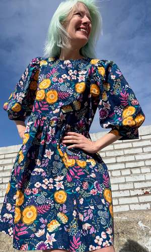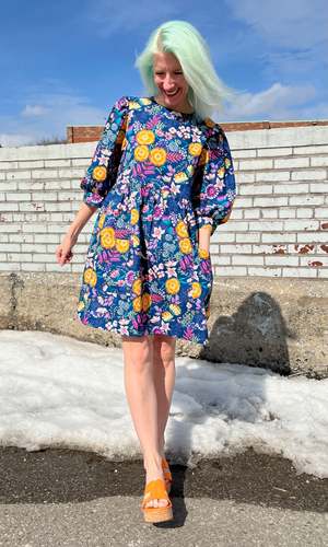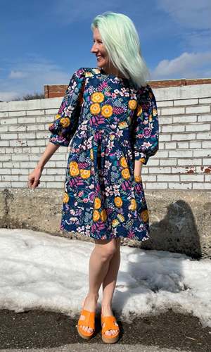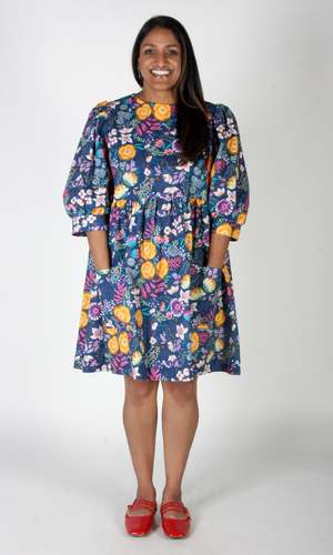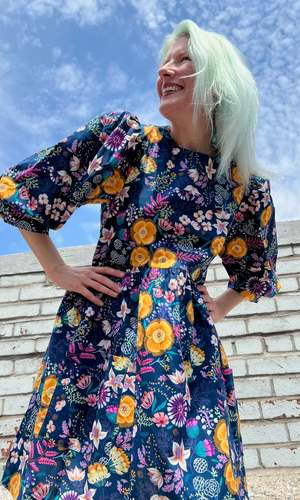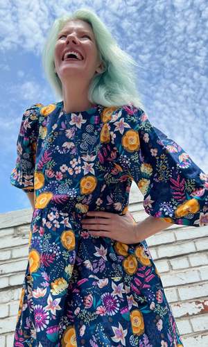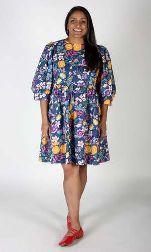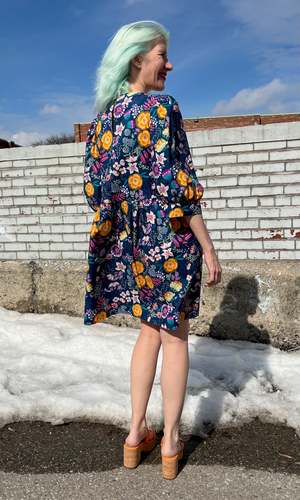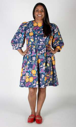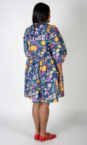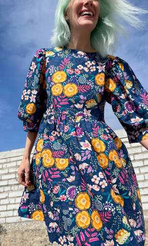 The Devil Downhead silhouette is a beloved style at Birds of North America, known for its comfort, ease of wear, and chic design. This dress features a tiered, relaxed fit with front patch pockets and ultra-full elbow-length sleeves gathered at the cuff. It is designed to pop on over the head and closes with a button and loop at the back neck. The Midnight Brilliance print showcases vibrant blooms in ochre, violet, cream, and magenta on a midnight blue background. Made of 100% cotton, it can be hand or machine washed on a cold, delicate cycle and hung to dry. This dress has a very relaxed silhouette; for a fit similar to the models, refer to our size chart. Hayley is 5'7" wearing size XS, and Mila is 5'5" wearing size L. Finished measurements (in inches) are as follows: XS - Bust/Hip: 38, Length: 36.5, Shoulder-to-Shoulder: 14.25; S - Bust/Hip: 39, Length: 36.5, Shoulder-to-Shoulder: 14.5; M - Bust/Hip: 40, Length: 36.75, Shoulder-to-Shoulder: 14.5; L - Bust/Hip: 42, Length: 37, Shoulder-to-Shoulder: 15; XL - Bust/Hip: 44, Length: 37.5, Shoulder-to-Shoulder: 15.5; 2X - Bust/Hip: 47, Length: 38, Shoulder-to-Shoulder: 16; 3X - Bust/Hip: 50, Length: 38.5, Shoulder-to-Shoulder: 16.5. Birds of North America garments are vegan and ethically made in Canada since 2007 with a focus on sustainability and high-quality craftsmanship.