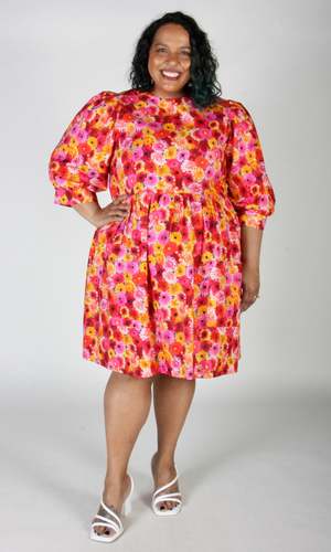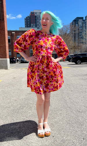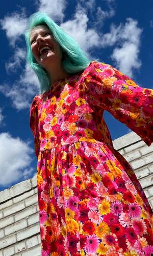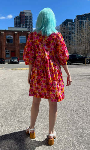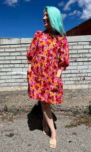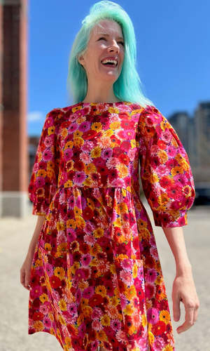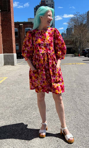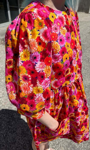 The Devil Downhead silhouette is a beloved style at Birds of North America, known for its comfort, ease of wear, and chic design. This dress features a tiered, relaxed fit with front patch pockets and ultra-full elbow-length sleeves gathered at the cuffs. It is designed to pop on over the head and closes with a button and loop at the back neck. The vibrant Petal Party print showcases an explosion of red, pink, and yellow Gerbera Daisies. Made of 100% cotton, this dress can be hand or machine washed on a cold, delicate cycle and hung to dry. The dress has a very relaxed silhouette; for a fit similar to what is shown on the models, follow the size chart recommendations for your body measurements. Everything at Birds of North America is vegan and ethically made in Canada since 2007, with a strong focus on sustainability and high-quality garments that last.