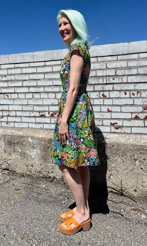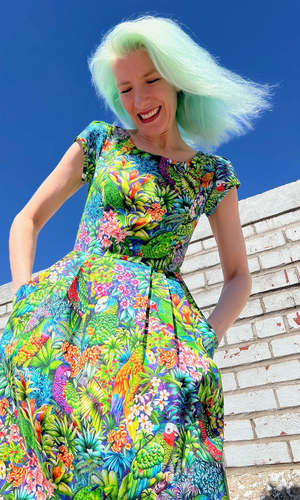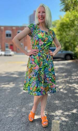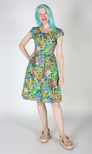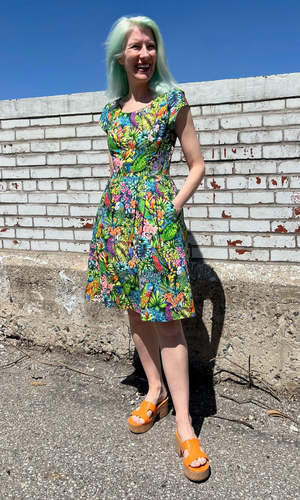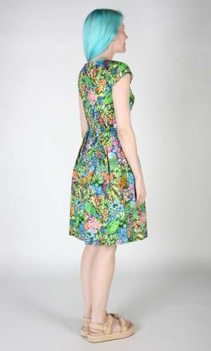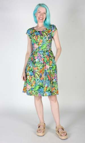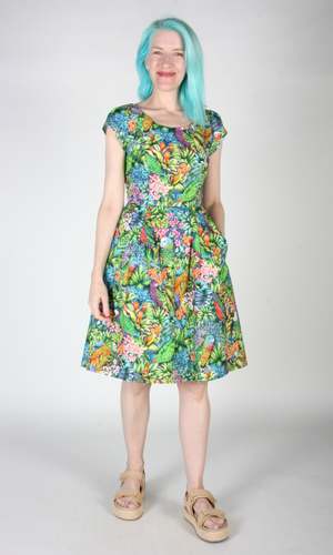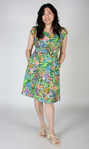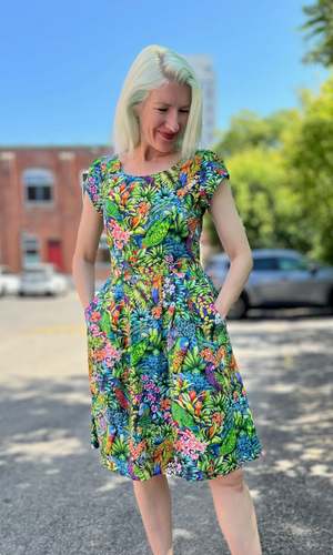 Gallinule is one of Birds' longest running styles, and it's back for the first time in over 2 years! This dress has our classic fit and flare cut, capped sleeves, pleats at the waist, and front skirt pockets with a back invisible zipper closure. This vibrant Parrot Jungle print features a tropical mix of foliage with colourful parrots peeking out! Gallinule is also available in Midnight Brilliance, Petal Party, and Flower Toss. This dress is made of 100% cotton, and the skirt is lined in OEKO-Tex certified cotton voile. It can be washed on a cold delicate cycle and hung to dry. This style fits true to our size chart. Hilary is 5'7" and wears our size 12, and Hayley is 5'7" and wears our size 6. Finished measurements of the actual dress in the bust/waist/hip, followed by shoulder-to-hem-length (in brackets), in inches, are as follows: 2 - 35 / 27 / 57 (39) 4 - 36 / 28 / 58 (39) 6 - 37 / 29 / 59 (39.5) 8 - 38 / 30 / 60 (40) 10 - 40 / 32 / 62 (40) 12 - 42 / 34 / 64 (40.5) 14 - 44 / 36 / 66 (41) 16 - 46 / 38 / 68 (41) 18 - 49 / 41 / 71 (41.5) 20 - 52 / 44 / 74 (42) Everything at Birds of North America is vegan and has been made ethically in Canada since we began in 2007. We have a strong focus on sustainability, and strive to create high-quality garments that last a long time.
