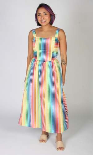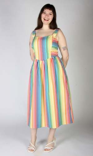 Birds of North America's Heathwren Dress is a whimsical summer sundress with pockets and a sweetheart neckline, made of beautiful rainbow striped cotton. The yoked waist drops to a point at the front and back, where it joins a gathered skirt. Sizing Notes: This dress is fitted without stretch. Please see below for the actual garment measurements or consult the size chart for fit guidance. Svenja is 6'0" and is wearing size 8. Erika is 5'0" and is wearing size 4. Ruby is 5'10" and is wearing size 12. Finished measurements of the actual dress in the bust/waist/hip in inches are: 2 - 33 / 27 / 58 4 - 34 / 28 / 59 6 - 35 / 29 / 60 8 - 36 / 30 / 61 10 - 38 / 32 / 63 12 - 40 / 34 / 65 14 - 42 / 36 / 67 16 - 44 / 38 / 69 18 - 47 / 41 / 72 20 - 50 / 44 / 75 Shoulder to hem measures: 48" (size 2) to 50.5" (size 20). Fabric: 100% cotton with a 100% OEKO-Tex certified cotton voile lining in the skirt. Care: Wash cold on delicate, hang to dry. Made in Canada. Also available in ZigZag.