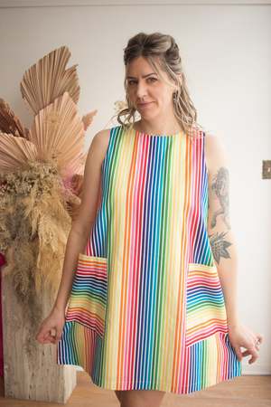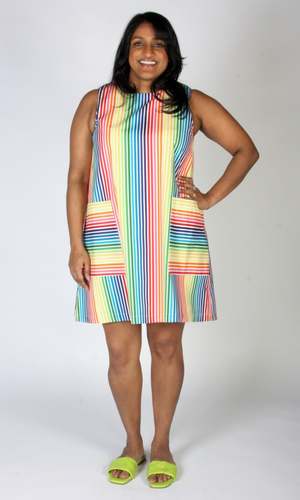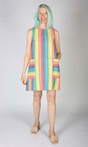 Birds of North America's Redpoll Dress is a summery cotton shift dress with front pockets. It pops on over the head and closes with a loop and button at the back. It is made of a gorgeous rainbow striped cotton and is fully lined in cotton voile. Sizing Notes: The Redpoll has a very generous cut and is meant to be roomy. To achieve a look similar to that of the models, we recommend consulting the size chart at the end of the photos or see below for exact garment measurements. Svenja is 6'0" and is wearing a size M. Hayley is 5'7" and is wearing a size S. Mila is 5'5" and is wearing a size L. Finished measurements of the body of the dress, in inches, are as follows: Bust/hip, then shoulder-to-shoulder (in brackets): XS - 38 / 50 (13) S - 40 / 52 (13.25) M - 42 / 54 (13.5) L - 44 / 56 (13.75) XL - 46 / 58 (14) 2X - 50 / 62 (14.5) 3X - 54 / 66 (15) Shoulder to hem measures: 34" (XS) - 38" (3X). 100% Cotton with a 100% Cotton Voile lining. Wash cold on delicate, hang to dry. Made in Canada. Also available in ZigZag.