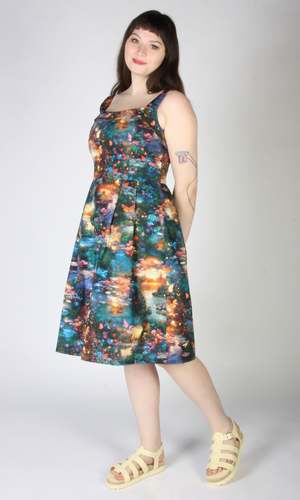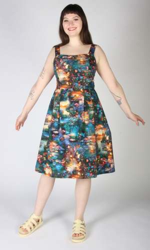 Courlis is a fully lined cotton sundress with princess seams, a flap over the bust, pleats at the waist, and generous skirt pockets. This richly coloured moonlit print features a flower-lined riverbed with delicate damselflies and other nighttime insects illuminated by the golden light of lanterns. Courlis is also available in Love Bugs and Bunny Rush. The body of the dress is 100% cotton, and it is lined in 100% cotton voile. It closes with a back invisible zipper. Ruby is 5'10" and wears size 12. Courlis measures 42" (size 2) to 45" (size 20) from shoulder to hem. This dress fits between a half-size and a size smaller than what the size chart indicates, so if you're between sizes, please take the larger one. This dress can be washed on a cold delicate cycle and hung to dry. Finished measurements of the actual dress in the bust/waist/hip in inches are: 2 - 33 / 26 / 57 4 - 34 / 27 / 58 6 - 35 / 28 / 59 8 - 36 / 29 / 60 10 - 38 / 31 / 62 12 - 40 / 33 / 64 14 - 42 / 35 / 66 16 - 44 / 37 / 68 18 - 47 / 40 / 71 20 - 50 / 43 / 74 Everything at Birds of North America is vegan and made ethically in Canada, with a strong focus on sustainability and creating high-quality garments that last a long time.