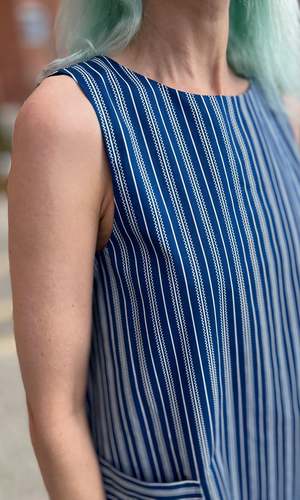Redpoll is a summery cotton shift dress with front pockets. It pops on over the head and closes with a loop and button at the back. It is made of a beautiful royal blue striped cotton and is fully lined in cotton voile. Redpoll is also available in Rock Candy. This dress can be hand or machine washed on a cold, delicate cycle and hung to dry. Redpoll dress has a very generous cut and is meant to be roomy. If you would like a fit similar to what you see on the models, you can follow our size chart recommendations for your body measurements. This style fits on the larger side, so if you are between sizes, we recommend taking the smaller one. Ruby is 5'10" and wears our size M. The length of Redpoll measures 34" (XS)38" (3X) from shoulder to hem. Finished measurements of the body of the dress, in inches, are as follows (bust/hip, then shoulder-to-shoulder in brackets): XS - 38 / 50 (13) S - 40 / 52 (13.25) M - 42 / 54 (13.5) L - 44 / 56 (13.75) XL - 46 / 58 (14) 2X - 50 / 62 (14.5) 3X - 54 / 66 (15) Everything at Birds of North America is vegan and has been made ethically in Canada since 2007. We have a strong focus on sustainability and strive to create high-quality garments that last a long time.