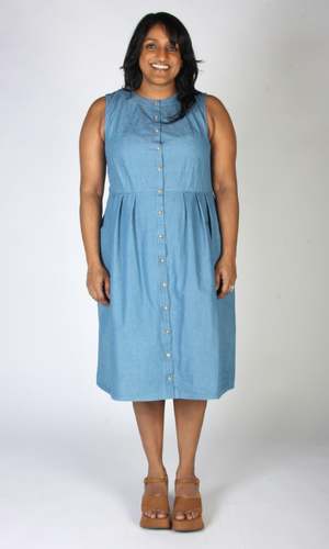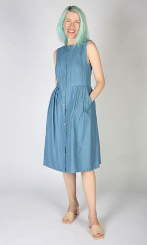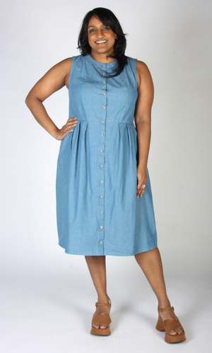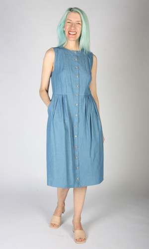Thunder Pumper is a relaxed fit dress with a front button placket, pleats at the waist, and pockets in the skirt. It is made of a very soft, lightweight OEKO-TEX certified cotton denim, and the dress has been pre-washed. This style is also available in a dark wash. Thunder Pumper has a very relaxed silhouette, and if you would like a fit similar to what you see on the models, you can follow the size chart recommendations for your body measurements. Hayley is 5'7" and wears size S. Thunder Pumper measures 41" (XS) to 43" (3X) from shoulder to hem. This dress fits on the smaller side in the bust, and with the buttons you want to make sure you have room so they do not pull. If you are between sizes, we recommend going with the larger size. Finished measurements of the dress bust/waist/hip, and shoulder-to-shoulder (in brackets), in inches, are as follows: XS - 34 / 31 / 58 (13) S - 36 / 33 / 60 (13.25) M - 38 / 35 / 62 (13.25) L - 40 / 37 / 64 (13.5) XL - 42 / 39 / 66 (13.75) 2X - 46 / 43 / 70 (14.5) 3X - 50 / 47 / 74 (15) Everything at Birds of North America is vegan and has been made ethically in Canada since the brand began in 2007. The brand has a strong focus on sustainability and strives to create high-quality garments that last a long time.
