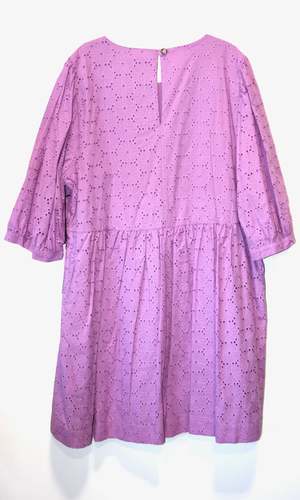 Special Notes: This item is part of our Studio Sale event and is lightly damaged. The pockets are supposed to be on the front side of the side panels, but they are on the back side, so they are placed more towards the back of the dress than they would normally be. They are still functional, just oddly placed. Bluebonnet is a relaxed fit, cotton eyelet dress with in-seam skirt pockets and full sleeves that gather into a cuff. It pulls on over the head and closes with a button and loop at the back neck. Bluebonnet is also available in White, Yuzu, and Black. Bluebonnet is made of 100% cotton eyelet, and the body is lined in matching OEKO-Tex certified 100% cotton voile. It can be hand or machine washed on a cold, delicate cycle and hung to dry. This dress has a very relaxed silhouette, so if you would like a fit similar to what you see on the models, you can follow the size chart recommendations for your body measurements. Marie is 5'1" and wears size 2X. The sleeve measures 18" (XS)19" (3X) from shoulder to cuff. Finished measurements of the body of the dress, in inches, are as follows: bust/hip, shoulder-to-hem length (in brackets), then shoulder-to-shoulder XS - 36 / 68 (36) 14.5 S - 38 / 70 (36.5) 14.5 M - 40 / 72 (37) 15 L - 42 / 74 (37) 15 XL - 45 / 77 (38) 16 2X - 48 / 80 (38) 16.5 3X - 52 / 84 (38.5) 17 Everything at Birds of North America is vegan and has been made ethically in Canada since 2007. The brand has a strong focus on sustainability and strives to create high-quality garments that last a long time.