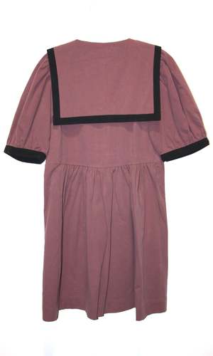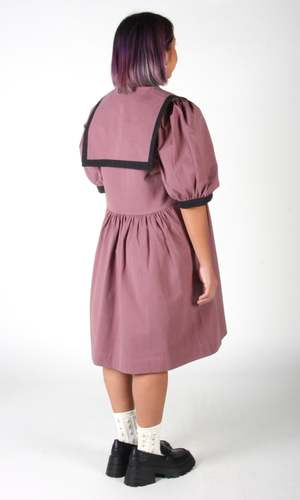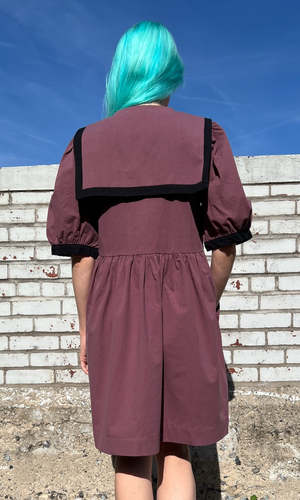 This nautically inspired Fulvetta dress is made of a heavy-weight, organic sand-washed cotton with a soft hand and a beautifully faded, vintage quality. Special notes: This item is part of a studio sale and is lightly damaged. The shoulders both have a faint, sun-faded line on the top of the collar. No other damage noted. Fulvetta has a full skirt with generous in-seam pockets, a V-neck with button-front placket, full sleeves that gather into a contrast cuff, and an oversized sailor collar with black edging. This fabric does not have any stretch and will shrink very little in the wash. The dress can be hand or machine washed on a cold, delicate cycle and hung to dry. Fulvetta has a very relaxed fit, but fits true to the Birds of North America size chart. Mila is 5'5" and wears a size L. Finished measurements of the actual dress bust/hip followed by shoulder-to-hem length (in brackets), in inches, are as follows: XS 38/70 (37) S 40/72 (37) M 42/74 (37.5) L 44/76 (37.5) XL 46/78 (38) 2X 48/80 (38) 3X 51/84 (39) Everything at Birds of North America is vegan and made ethically in Canada.