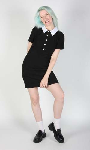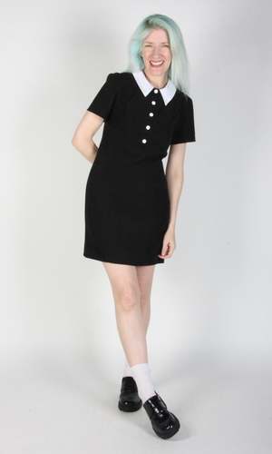 Special Notes: This item is part of the Studio Sale event and is lightly damaged. There is a faint dark streak on the right front collar. Peep is a tailored, panelled dress with a little white collar, white buttons, and short sleeves. It is fully lined in soft stretch satin and closes with a back invisible zipper. The fabric is a soft, stretchy velvety fabric. Peep can be hand or machine washed on a cold delicate cycle and hung to dry. The fabric content is 97% polyester and 3% spandex. It measures 34 from shoulder to hem. Candy is 6'1" and wears size 12, and Hayley is 5'7" and wears size 6. Made in Canada.