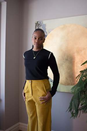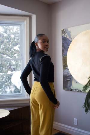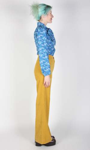 It's time to boogie in Birds of North America's Bloodfool Pants! These 70s-meets-90s flares are made out of a suede-like polyester with a velvety finish. They have a high waist, fly front closure and button waist. We love the practical and big patch pockets on both the front and back. The fabric has a stretch to it that will make these pants fitted on your booty before gliding all the way down to the floor. These would be great for work with a neutral blouse or for a fun night out with a tank top and platform boots. We love the bold yellow colour that would pair great with tops in blue, purple and white! Styled with Mercedes Morin Addams Sizing Notes: These pants are fitted in the waist and bum with volume in the leg. We recommend your usual size or sizing one up if you prefer a bit of room. Please consult the size chart for fit guidance. Still unsure? Send us an email! Marlie is wearing size 2. Hailey is wearing Size 6 33" Inseam 12" Rise 97% Polyester, 3% Spandex Fabric has a velvety suede-like finish and has stretch to it Wash cold, hang to dry Made in Canada Also available in Sepia, Black, Mulberry and Marmalade When you shop at Victoire, you're supporting independent designers and Canada's garment industry. This garment is designed by Hayley Gibson and proudly manufactured in Canada. Hayley has been making and designing clothes since 2007 and it's because of customers like you that her label can thrive!