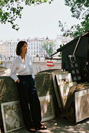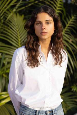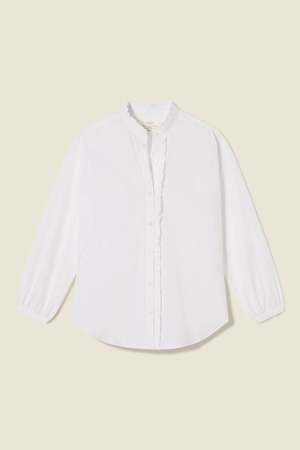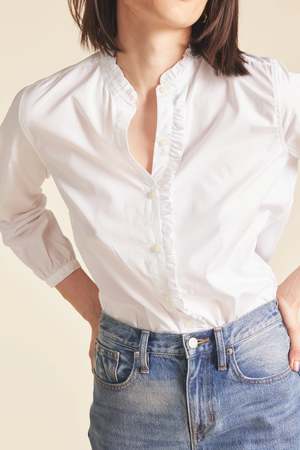description: A classic button-down shirt with added feminine details to create this shirt style. The standup collar and centre front button placket have self-fabric ruffle details. Long sleeves gather into narrow cuffs with button closures. fabric: 100% Cotton Breathable and meant for summer time light layers Machine wash cold, separately. Tumble dry low, medium iron as needed. All Trovata fabrics are handmade in California measurements: Skimming or loose depending on preference. Model is 5'7" and wearing a size S.