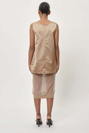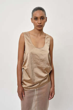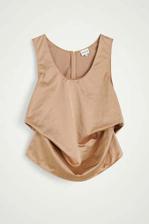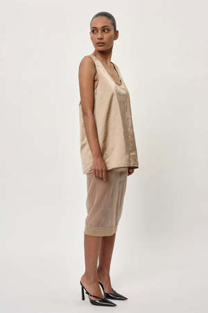 Introducing the Pandora Top: A sleeveless top with a deep round neckline, featuring strings that can be tied inside for an organic look. - Sleeveless top - Deep round neckline - String detail for a customized look - 100% Recycled Nylon - Model is 174 cm tall and wears size S/36