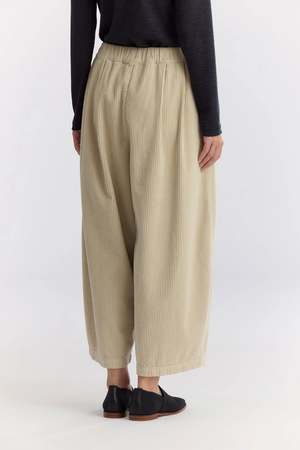 Crafted from luxurious 100% cotton corduroy, these pants feature a comfortable, wide-legged silhouette that tapers at the ankle. An elasticized waistband, drop crotch style, and practical side pockets add ease and functionality. Creased box pleats on both the front and back add a touch of sophistication to the design. Details: - 100% cotton corduroy - Cold machine or hand wash - Tumble dry low or dry flat - No bleach - Made in USA Santiago is 5'9" and wearing a size L. GARMENT MEASUREMENTS SIZE XS - Waist 26" - Waist (stretched) 29" - Hip 42" - Inseam 23" - Length 36" SIZE S - Waist 27" - Waist (stretched) 30" - Hip 44" - Inseam 23" - Length 37" SIZE M - Waist 28" - Waist (stretched) 32" - Hip 46" - Inseam 23" - Length 37" SIZE L - Waist 30" - Waist (stretched) 34" - Hip 48" - Inseam 24" - Length 38" About the brand: Black Crane is a brand created by Alexander Yamaguchi and Momoko Suzuki. With a focus on designing garments that are an extension of your lifestyle, they concentrate on silhouettes you should be comfortable in and that complement your daily life. All garments are produced in Los Angeles using natural fibres that are renewable, biodegradable, and long lasting.