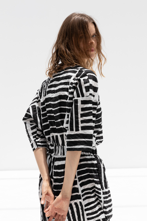 Square neck top with dropped shoulders and textured fabric featuring a geometric print pattern. Made from 100% Japanese cotton. Cold machine or hand wash, tumble dry low or dry flat, no bleach. Model is 5'8" and wears size S. Made in USA.
