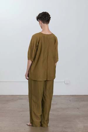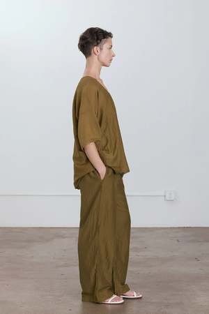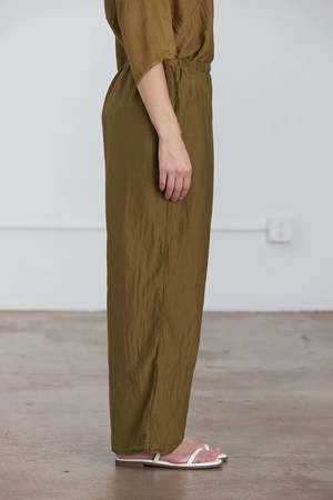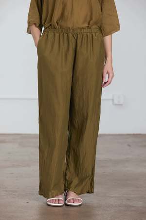 - Straight silhouette - Elasticized waistband - Side seam pockets - 41% Silk 59% Cotton woven - The fabric has a slight natural wrinkle due to its composition - To minimize wrinkles, it's best to lay flat or hang it on a hanger when not in use. - Hand wash in cold water, dry flat, no bleach - Use a steamer to remove wrinkles if necessary - Style Number: SC-SP18 - Regular fit at the waist - Made in USA - Model wears size S - Model is 5'8" bust 32" / waist 28" / hip 35"