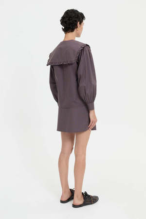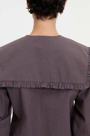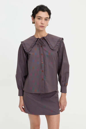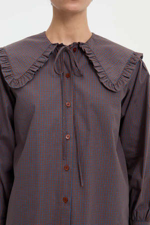 A long-sleeve shirt in a relaxed, straight silhouette. Cut from lightweight cotton in a micro brown and blue check, it features an oversized ruffled collar with adjustable tie detailing, a classic button-down front, and gathered cuffs. Designed for repeat wear, it pairs seamlessly with the matching Maja Skirt. - Oversized, relaxed fit with effortless structure - Lightweight cotton with a crisp, breathable feel - Classic button-down front with dropped shoulders Details 100% Cotton Sizing XS: Centre back length - 57cm Chest - 94cm Shoulder - 42cm Hem - 95cm Sleeve length - 54cm S: Centre back length - 59cm Chest - 102cm Shoulder - 44cm Hem - 103cm Sleeve length - 56cm Model 1 height is 177cm / 59 and wears a size S. Model 2 height is 178cm / 58 and wears a size S.