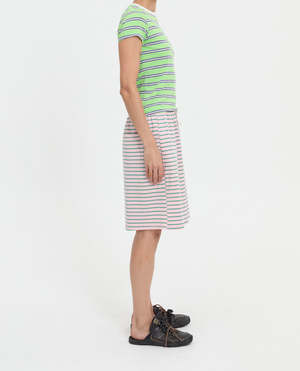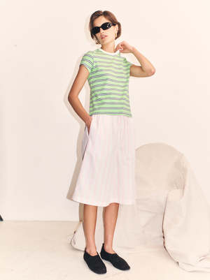 The Cola Tee in green updates a classic silhouette with subtle colour play. Cut close through the body, its crafted from soft stretch cotton for a smooth, comfortable fit. Fine purple stripes run across a bright green base, offset by a clean white neckline. A simple piece with just enough edge. - Baby tee silhouette - Fitted style with soft stretch - Crew neckline and short sleeves Details 95% Cotton 5% Elastane Sizing Model 1 height is 178cm/5'8" and wears a size S. Model 2 height is 177cm/59 and wears a size S.