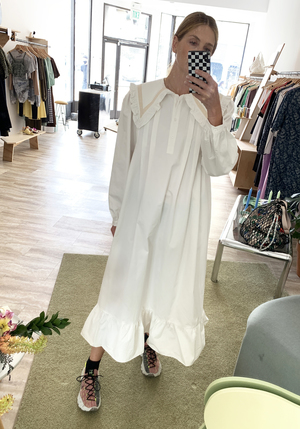Prairie style dress cut from a heavy white cotton. Large oversized sailor style collar tipped with off white lace. Ruffle detail at collar and hem. Pleats at chest gives a loose relaxed billowy fit. One size - fits size S-L best. Wash Cold or Dry Clean 100% Cotton Made in China