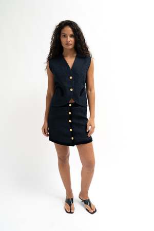This Italian-made Gliss bolero boucl vest from Blaz Milano is crafted from a cotton-blend tweed. The slightly cropped, structured silhouette is finished with gold detail buttons. Details & Care - 55% Cotton, 29% Viscose, 13% Polyamide, 3% Linen - Front button closure - Button cuffs - Four front pockets - Lined Size & Fit - Fits true to size - Model wearing size I/S - Size conversion: 0/XS, I/S, II/M, III/L, IV/XL Additional Information - Color: Blue - Made in Italy.