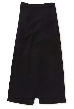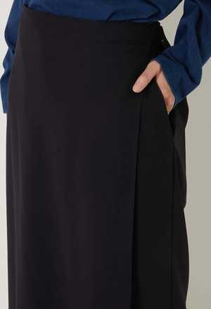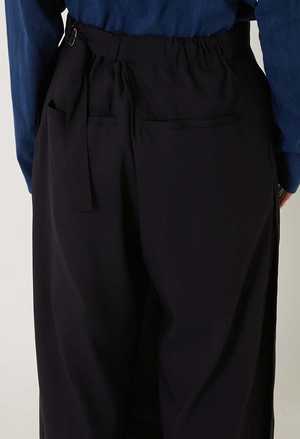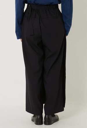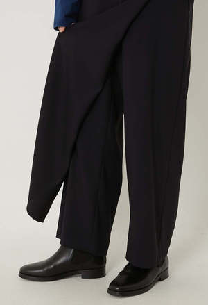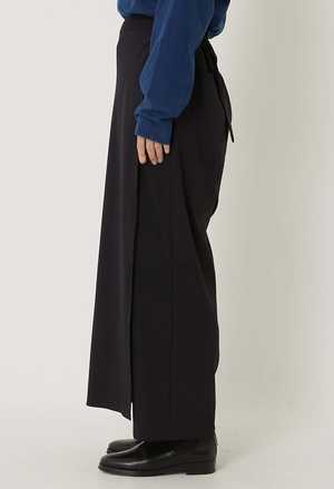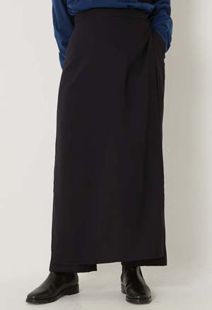 These pants feature a full wide silhouette with overskirt details for added depth. The waist is drawstring style, and the front wrap cloth passes through the waist belt loop, creating a skirt-like appearance from the front and pants from the back. Material: The warp thread is made of tightly twisted viscose yarn wrapped around polyester yarn, while the weft thread blends viscose and polyester with added polyurethane. Viscose provides excellent luster and drape, while polyester adds wrinkle resistance and ease of care. The tightly twisted yarn gives a crisp texture similar to wool. Sizing: S: Waist 68cm / Thigh width 35.5cm / Length 68.5cm / Hem width 27cm M: Waist 73cm / Thigh width 37cm / Length 72cm / Hem width 27.5cm Made in Japan.